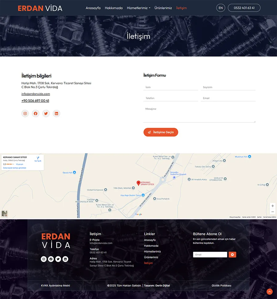 Erdan Vida, sunduğumuz profesyonel hizmetlerle dijital dünyada güçlü bir marka varlığı kazandı. Web sitesi, firmanın vida ve bağlantı elemanları ürünlerini etkileyici bir şekilde tanıtan, müşterilerle iletişimi güçlendiren bir platform haline geldi. Sosyal medya entegrasyonlarıyla marka bilinirliği artırıldı ve sektördeki rekabet avantajı desteklendi.